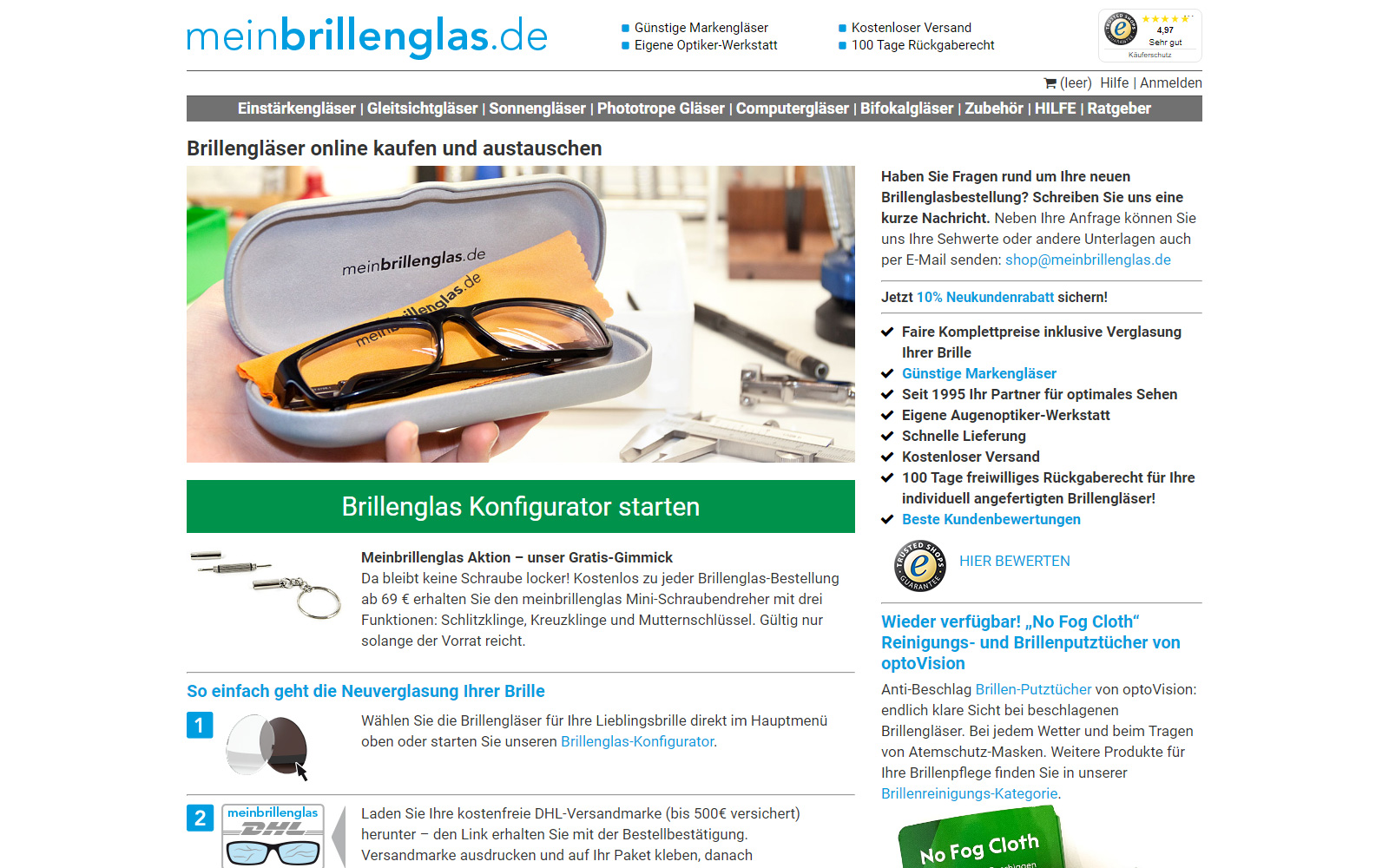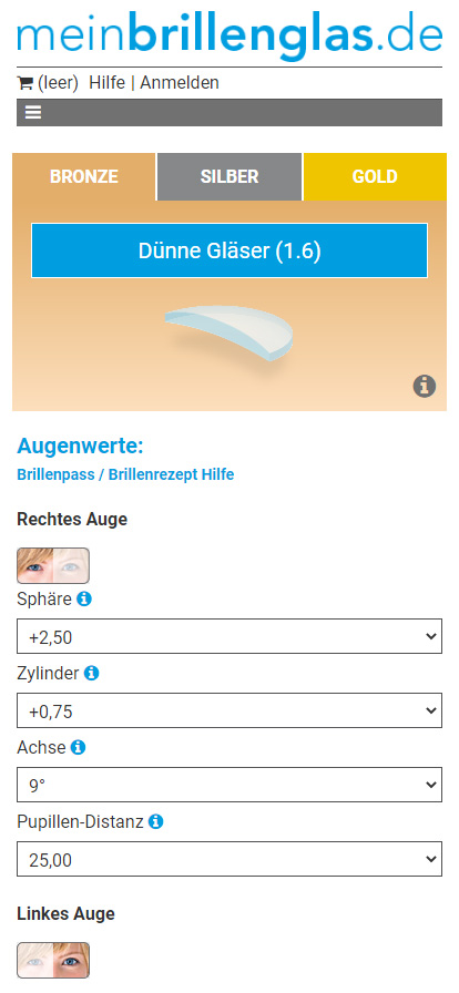Im meinbrillenglas-Shop können alle Arten von Brillengläsern bestellt werden: normale Brillen, Gleitsichtbrillen, Sonnenbrillen mit verschiedensten Sorten von Gläsern. Sehstärke und andere Parameter können bis ins Detail konfiguriert werden.