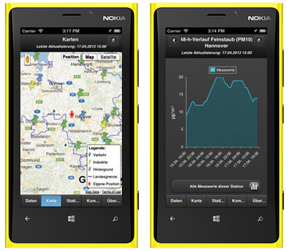 Für das Lufthygienischen Überwachungssystems Niedersachsen (LÜN) wurde eine Mobile App entwickelt, die Messdaten der Luftqualitäts-Messstellen und deren zeitliche Verläufe übersichtich darstellt.