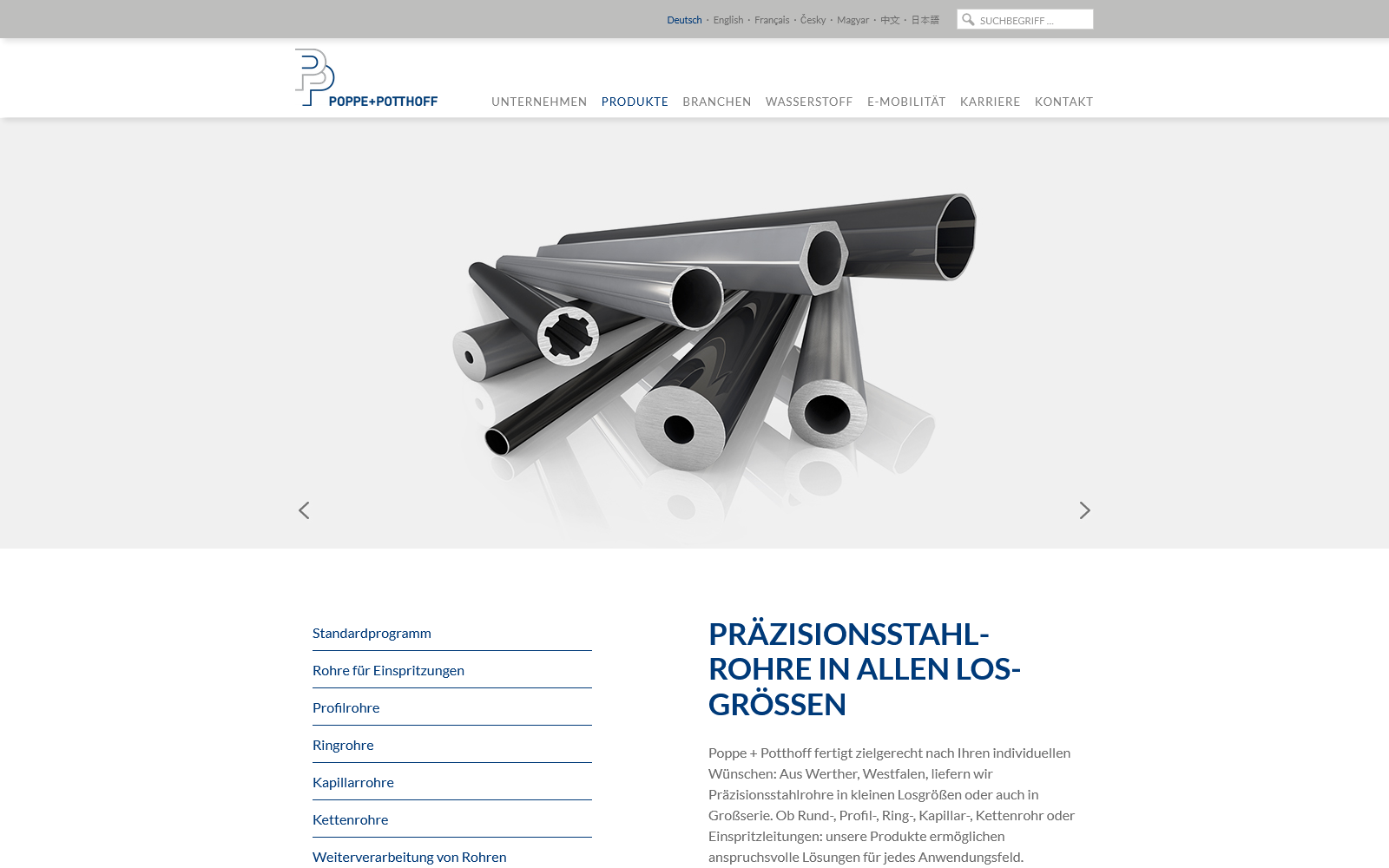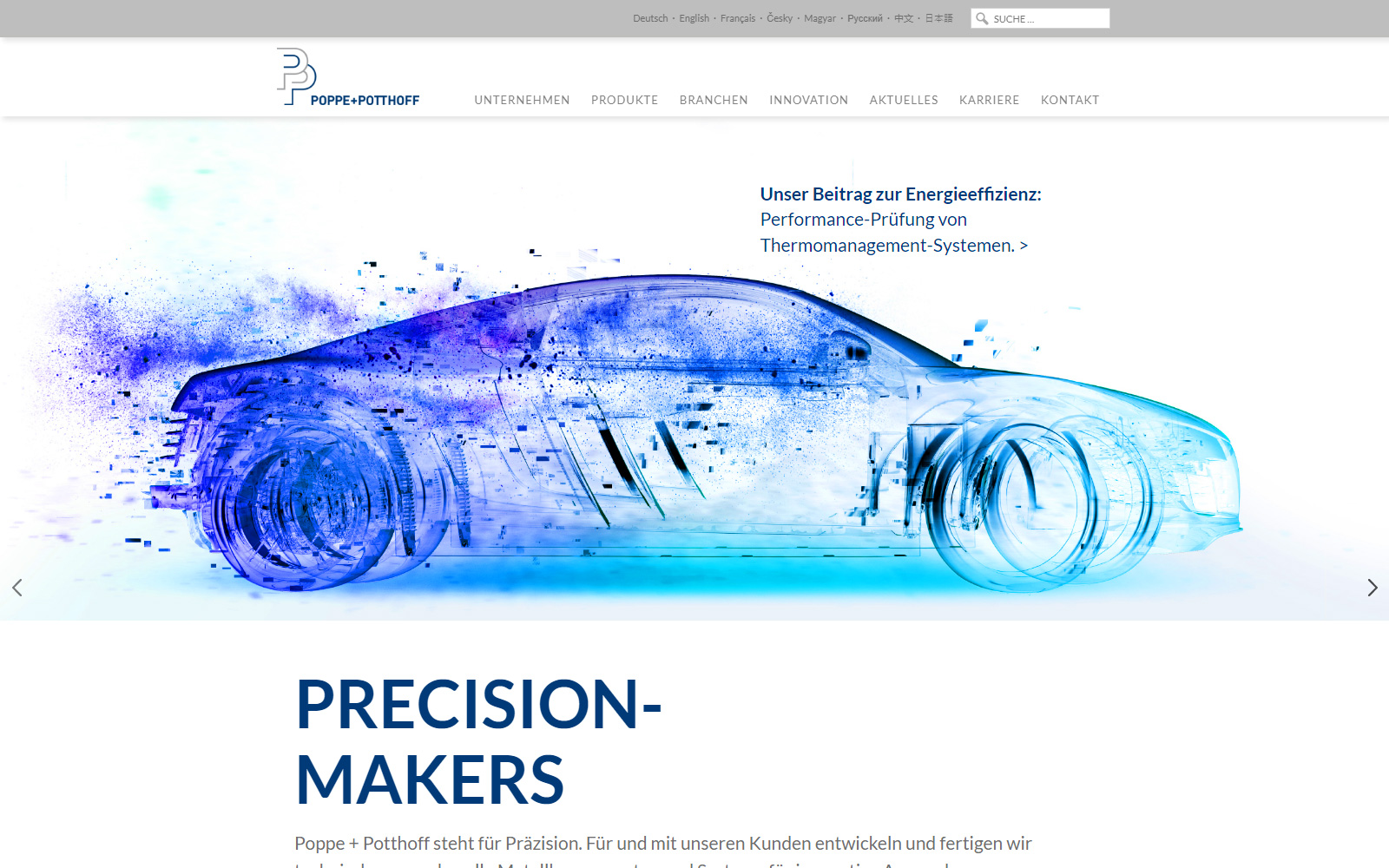 1928 gegründet ist das Familenunternehmen Poppe+Potthoff weltweit mit 1200 Mitarbeitern an 14 Standorten vertreten. Die Produktpalette umfasst Präzisionsstahlrohre, Common Rail Subsysteme und Hochdruckleitungen, Präzisionskomponenten, Spezialmaschinen, Kupplungen sowie Edelstahlgeländer Systeme.